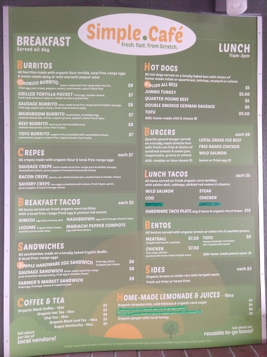 Simple Cafe also caters well to your hydration needs, offering refreshing beverages such as Hibiscus Rosemary Lemonade and Ginger and Honey Lemonade—perfect cozy companions to those delectable tacos and burgers.